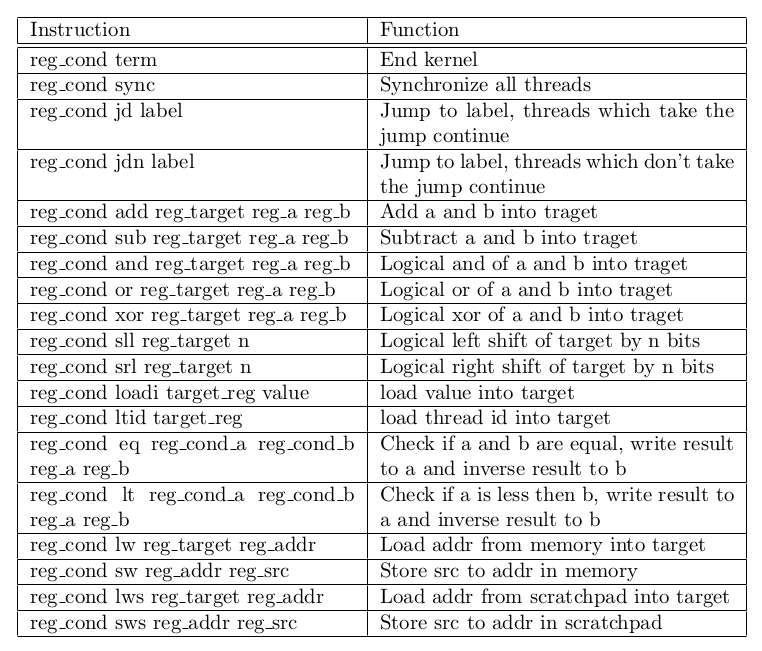 Since the coprocessor is synthesized on an FPGA, a pipeline is used to exploit concurrency. Since enough space is available on the FPGA, it makes sense to use this logic for a pipeline. This pipeline is quite similar to a standard RISC-pipeline and is composed of five pipeline stages. Instructions are executed in an SIMD fashion. Therefore, the register file contains registers for every thread and the execution stage contains one ALU per thread that can be executed within one warp.